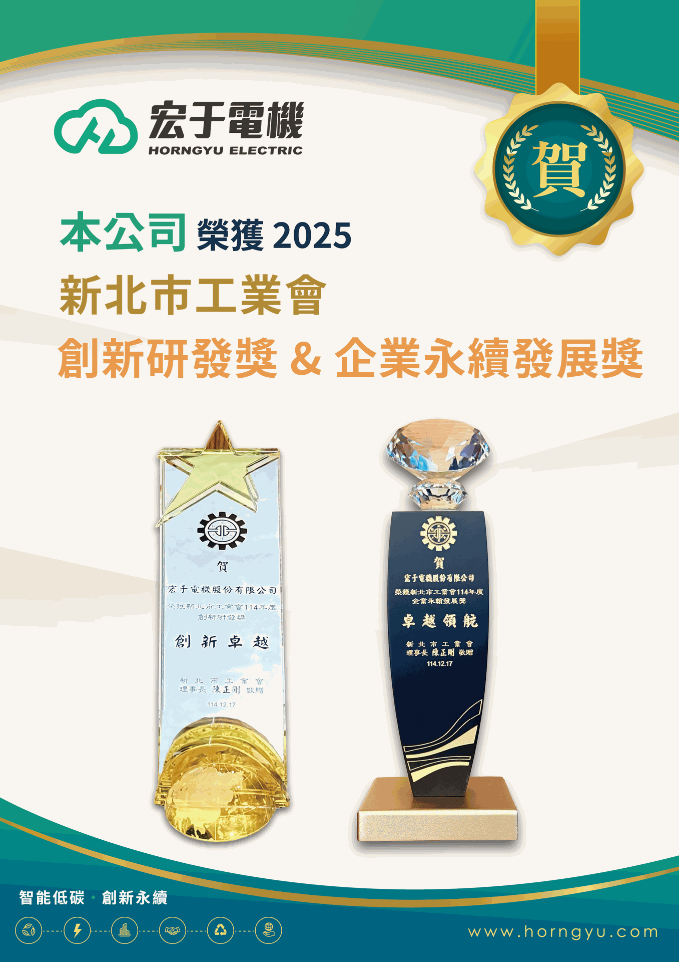 【榮耀時刻|雙獎肯定】 宏于電機榮獲新北市工業會頒發的「創新研發獎」與「企業永續發展獎」雙項殊榮,展現企業在技術實力與永續經營上的雙重競爭力。 多年來,宏于電機持續投入研發資源,專注於智能化與AI技術的創新,致力提升產品效能與品質,為客戶創造更高的價值。同時,我們也積極回應全球永續趨勢,從節能減碳、綠色製造到企業治理,逐步落實ESG精神,在追求企業成長的同時,也為社會與環境盡一份責任。 雙獎榮耀除了歸功於團隊努力,更是對企業的肯定。宏于電機在轉型升級與永續發展,將帶動產業穩健前行,為智慧能源貢獻關鍵力量。