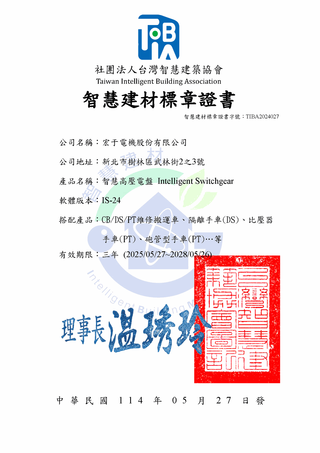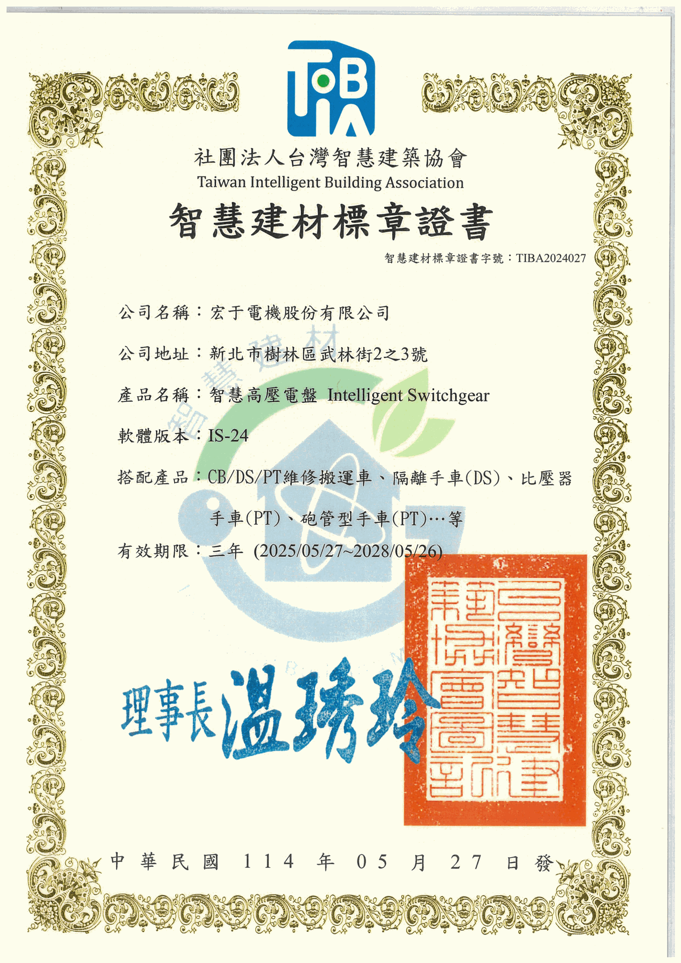 宏于電機「 IS-24智能高壓配電盤」榮獲2025智慧建材標章認證