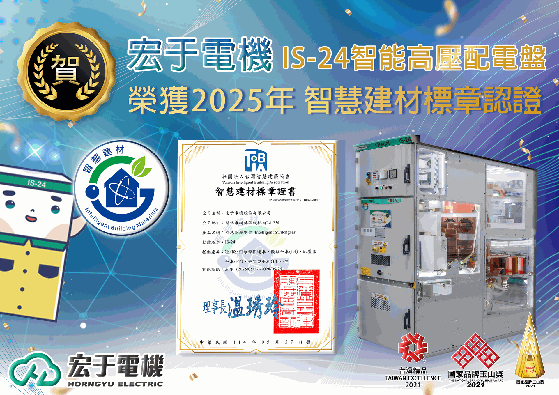 賀!宏于電機IS-24智能高壓配電盤再創殊榮,榮獲2025年智慧建材標章認證!