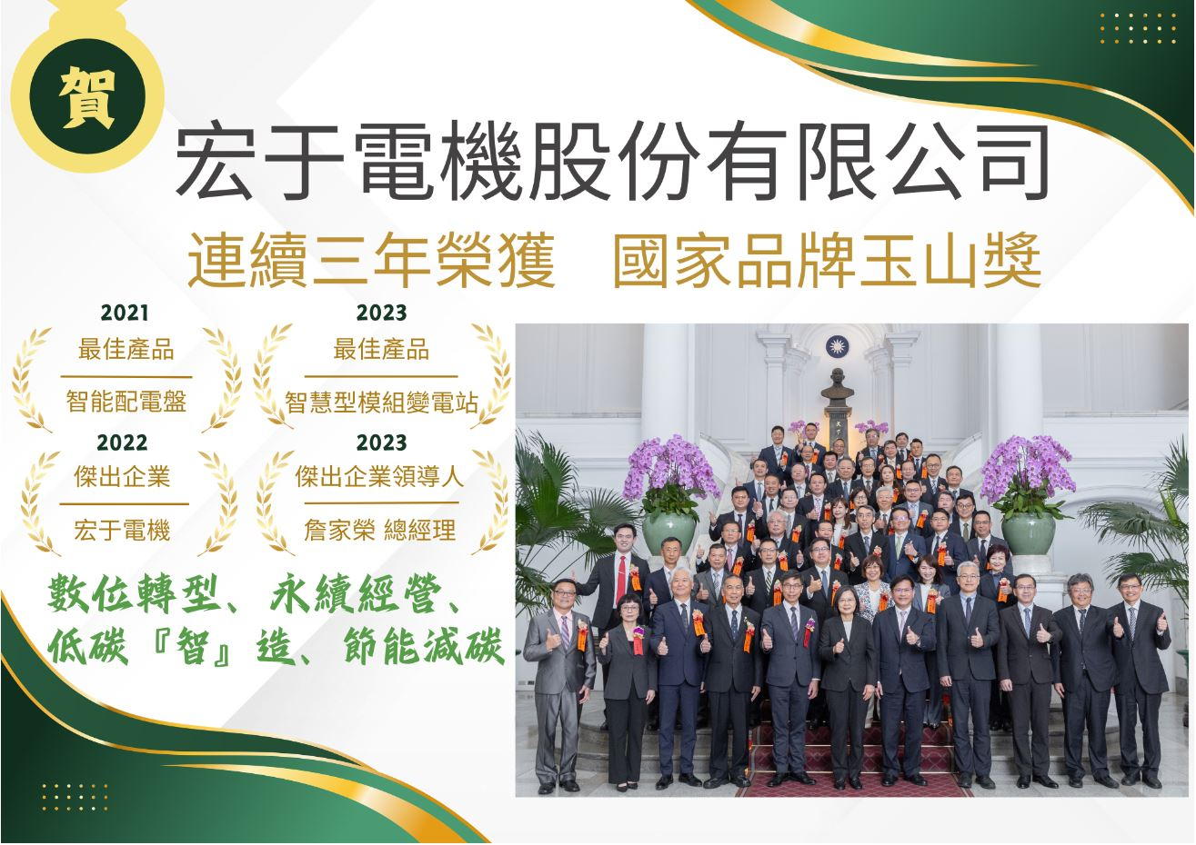宏于電機連續三年榮獲國家品牌玉山獎首獎