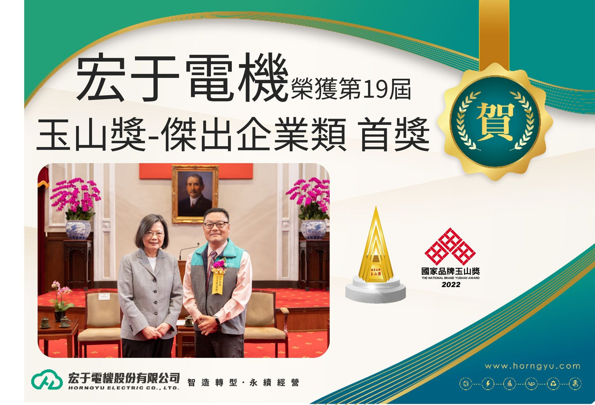 宏于電機連續2年獲得國家品牌玉山獎首獎殊榮