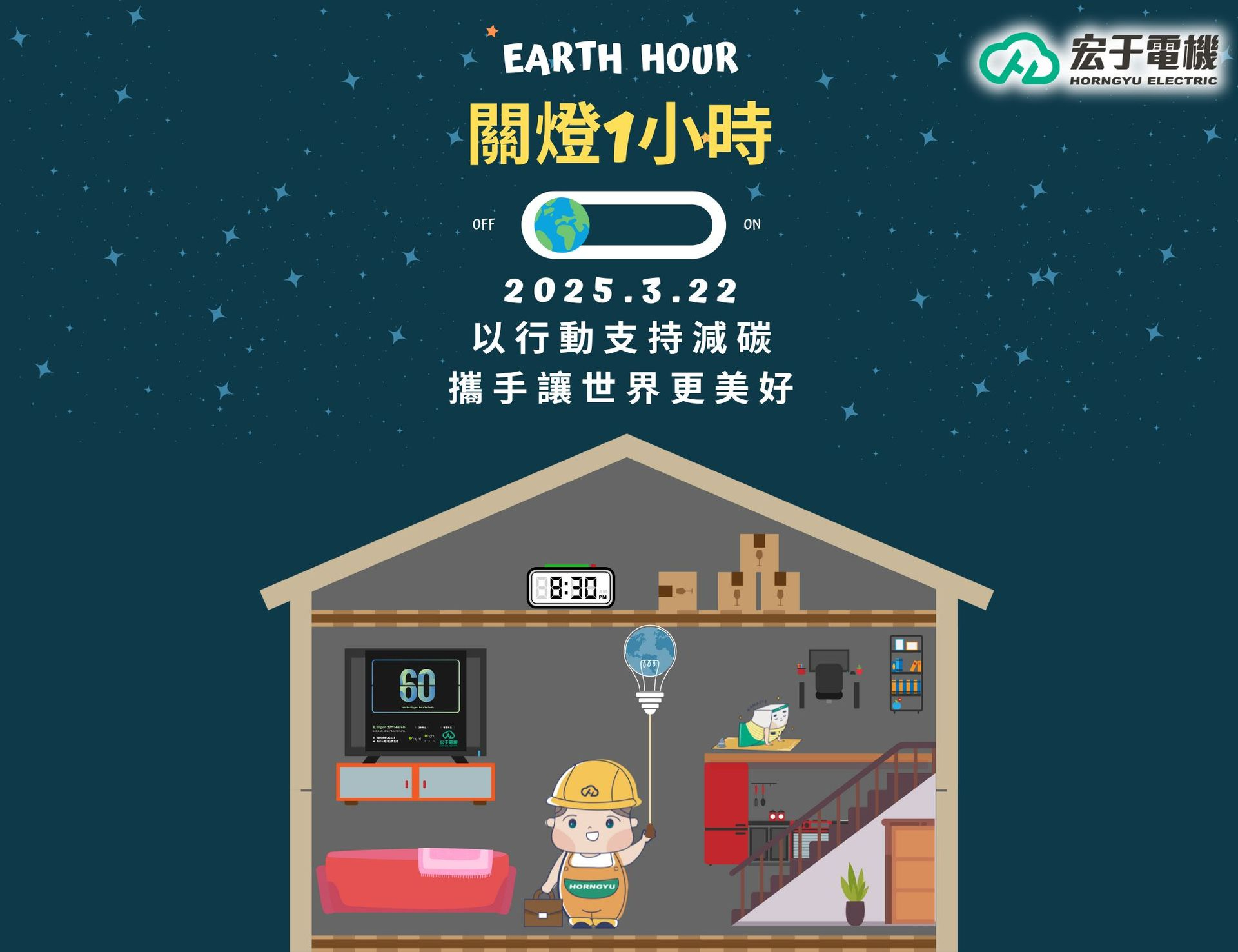 宏于電機響應「Earth Hour 關燈一小時」活動,邀請大家於3/22(六)20:30至21:30關閉不必要的電源,減少能源消耗,為環境永續貢獻一份力量。這不僅是一場關燈活動,更是對地球的保護,讓我們走出室內,感受夜晚的寧靜與星空的美好,用行動守護我們唯一的家園! 一起以行動支持節約能源,攜手讓世界更美好。 #宏于電機 # Earth Hour #關燈一小時 #為地球永續關燈 #用行動守護地球 #能源轉型 #碳排淨零